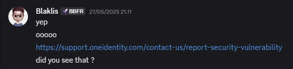 Blaklis personally contacted people from Bugcrowd, HackerOne, LinkedIn and X and eventually somehow found an active channel for reporting security issues to OneIdentity.