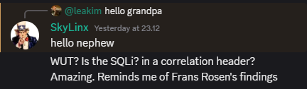 SkyLinx and I decided to team up in this investigation, since we were sure my finding and his extensive experience on developing and securing web applications would lead to something fruitful. This was also for him the first time seeing a SQL injection in a correlation header.